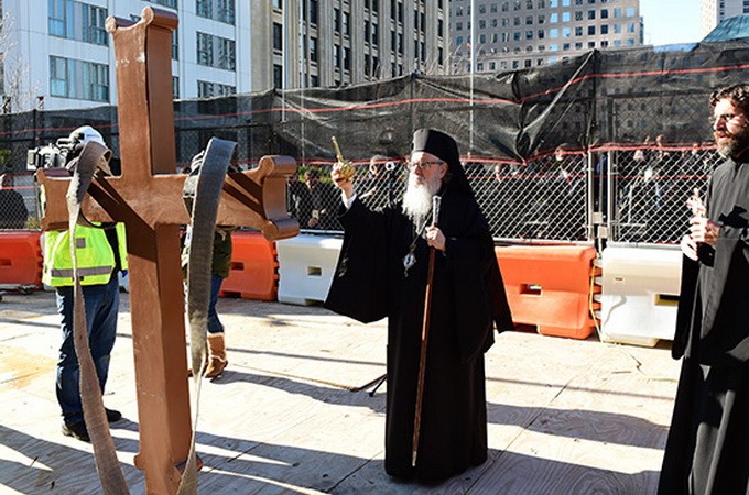 Archbishop Demetrios of America blessed the cross using holy water in addition to water taken from the National September 11 Memorial & Museum pools and said, "We look around today we see the triumph of human spirit and human mind that can overcome any tragedy. Saint Nicholas will offer us the presence of God in our lives and in our city. Here, at this spot, we raise the Cross, which is a symbol of sacrifice and victory, and we offer prayers for the continued construction process."