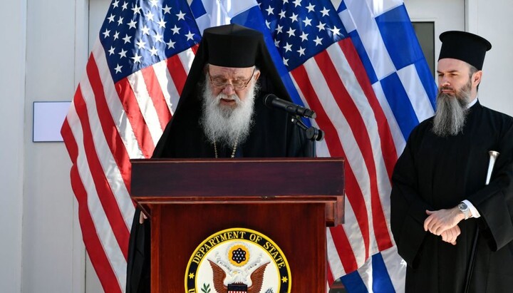 Archbishop Ieronymos speaking at the U.S. Embassy. Photo: MICHAEL VARAKLAS/POOL/AFP