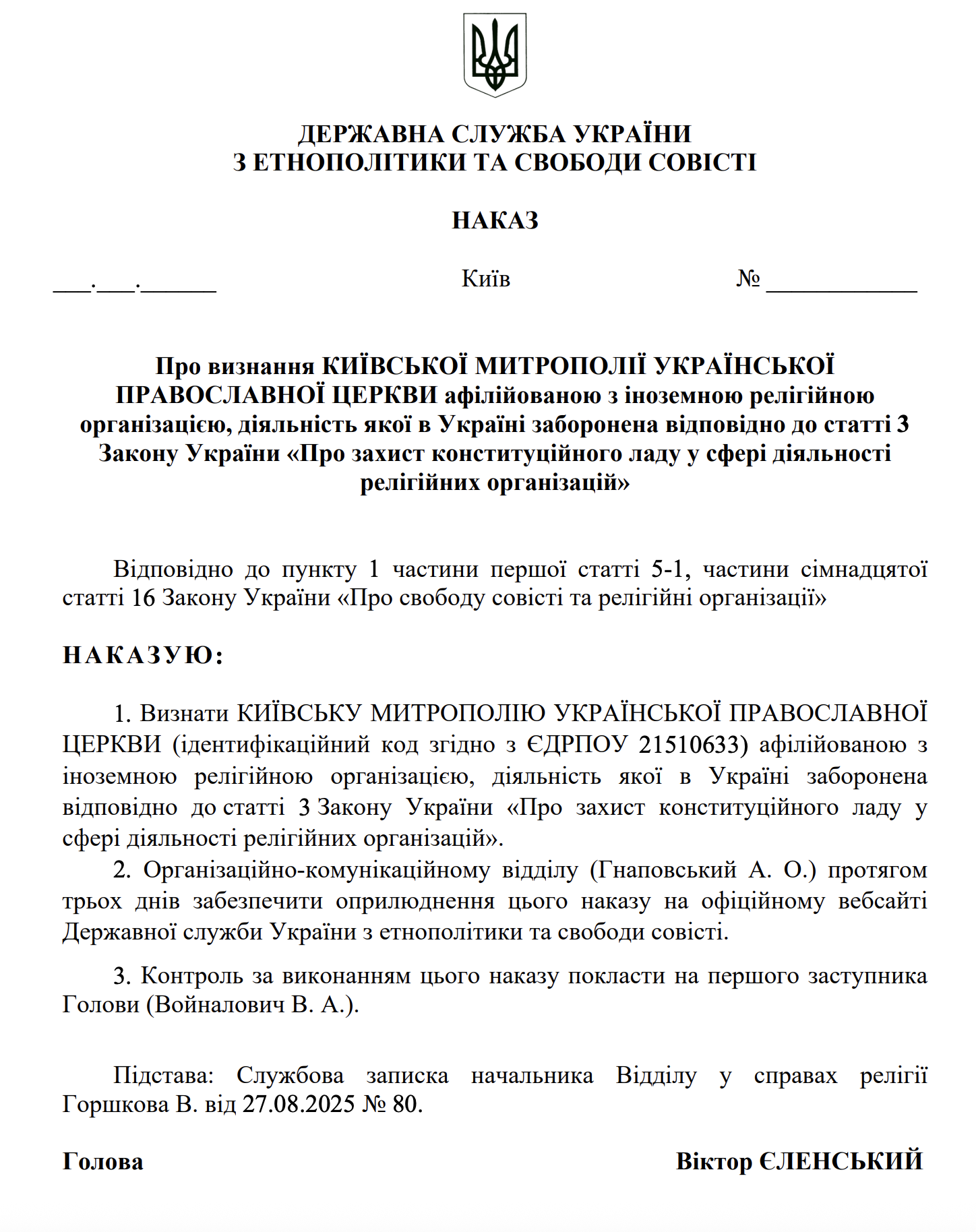 On August 27, 2025, the State Service for Ethnopolitics and Freedom of Conscience (DESS) adopted a decision recognizing the Kyiv Metropolia of the Ukrainian Orthodox Church as affiliated with Moscow. The corresponding decree was signed by the head of DESS, Viktor Yelensky.