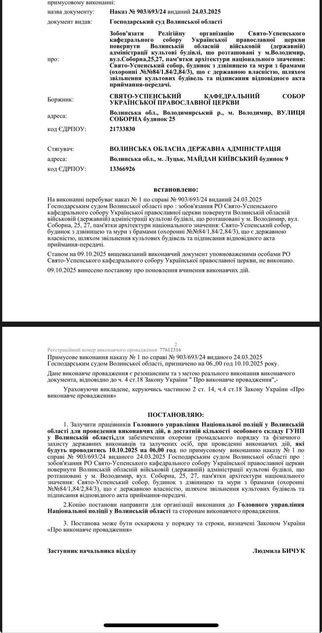 Tomorrow, October 10, 2025, at 6 a.m., a forcible eviction of the parish of the Assumption Cathedral of the Volodymyr–Volynsky Eparchy of the UOC in Volodymyr is scheduled to take place. This was reported by the parish’s lawyer, Archpriest Nikita Chekman, on his Telegram channel.