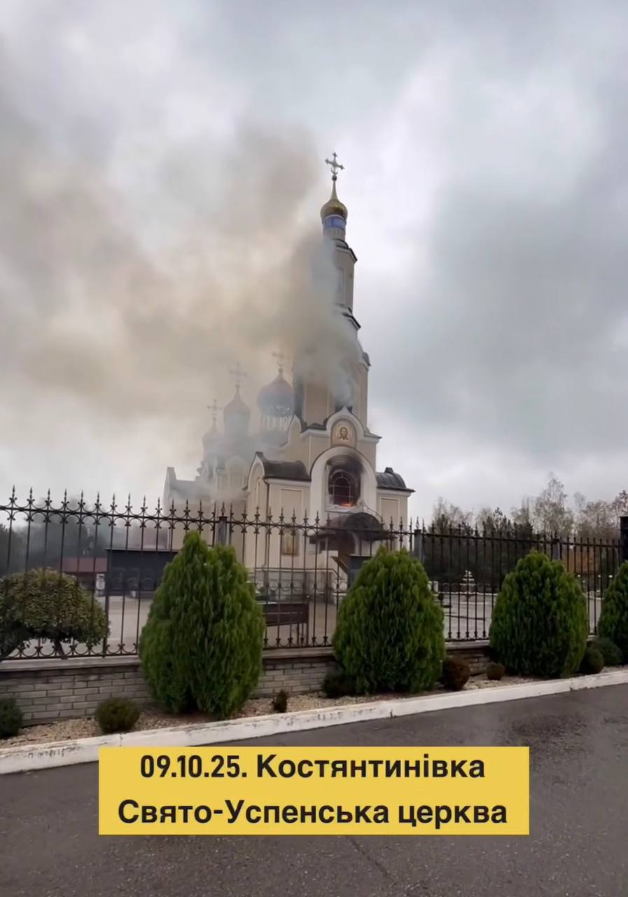 On October 9, 2025, in Kostiantynivka, Donetsk region, the Dormition Cathedral of the Ukrainian Orthodox Church was destroyed by fire following a shelling, according to a report from the Pokrovsk Vicariate.