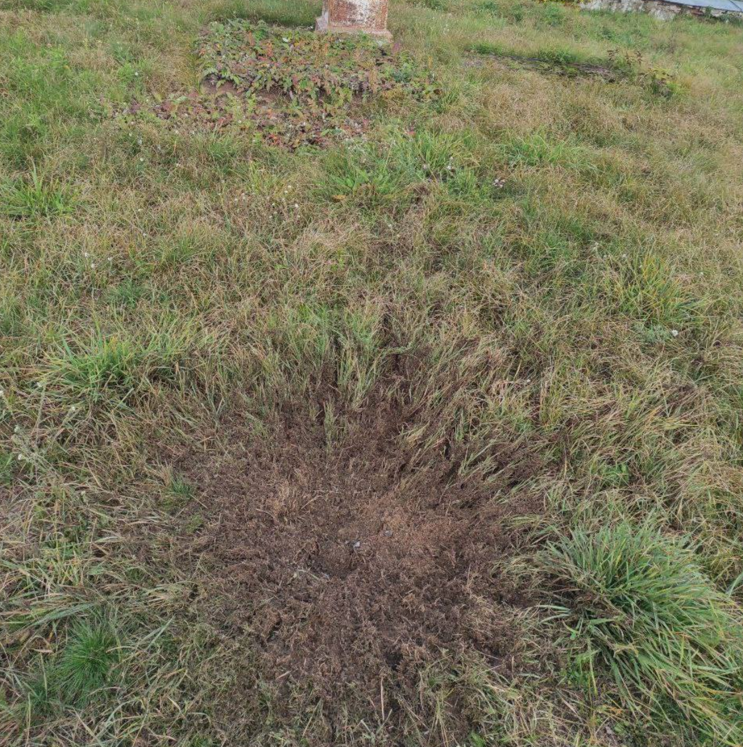 The church’s walls were damaged, windows shattered, and a shell crater formed on the grounds.