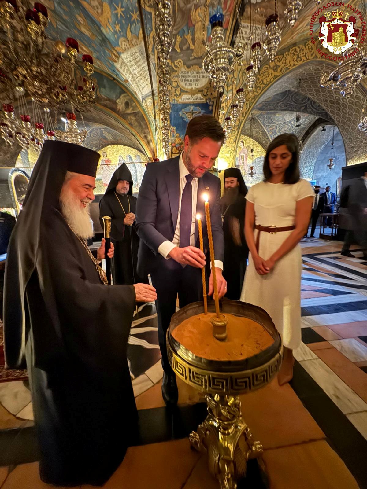 Patriarch Theophilos III of Jerusalem received U.S. Vice President J. D. Vance and his wife Usha Vance at the Church of the Holy Sepulchre.