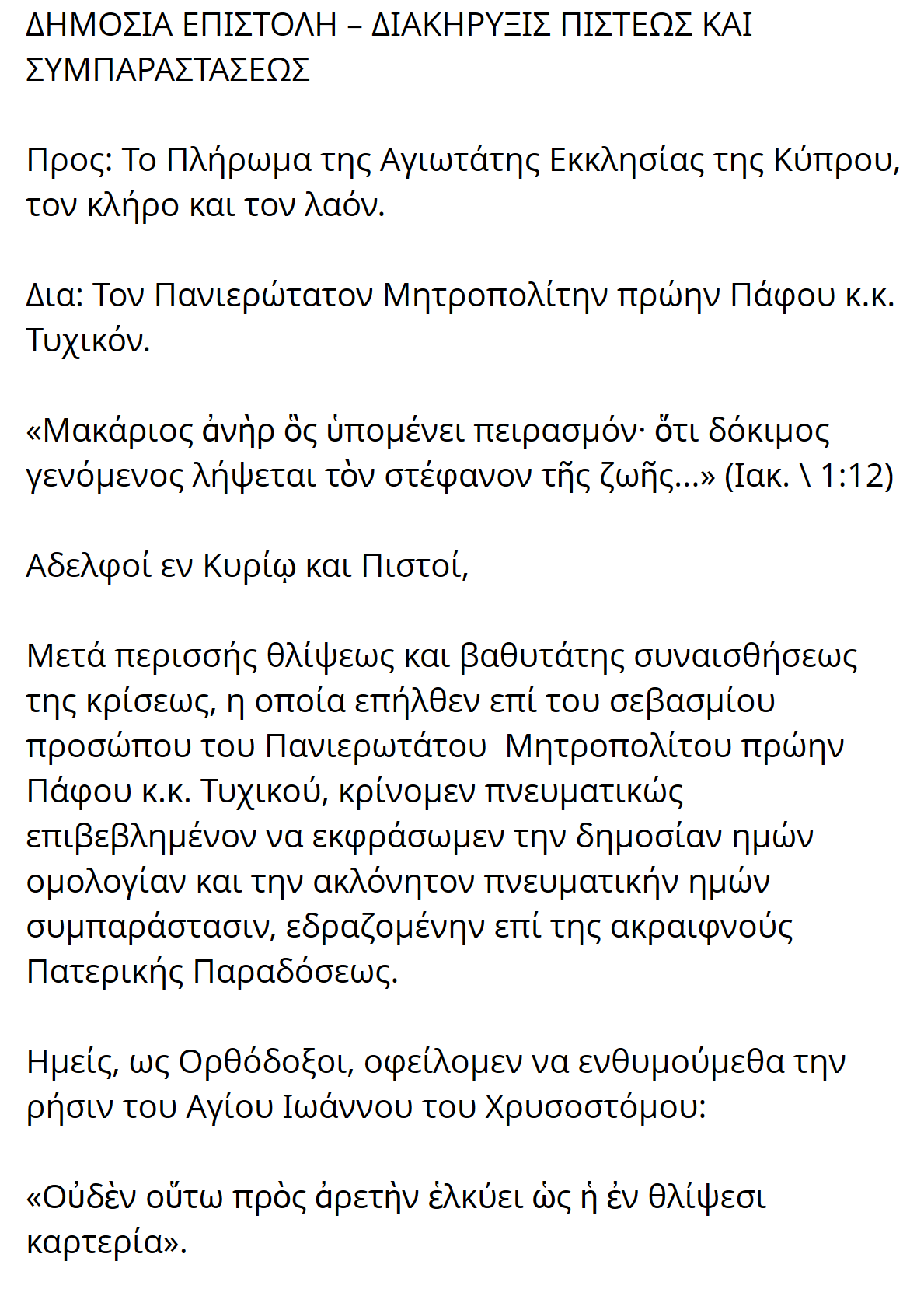 In the appeal, the authors express their "deepest sympathy for the crisis that has befallen the venerable person of His Eminence, the former Metropolitan Tychikos of Paphos", and declare their "unwavering spiritual support, based on the purity of the Holy Fathers' Tradition".