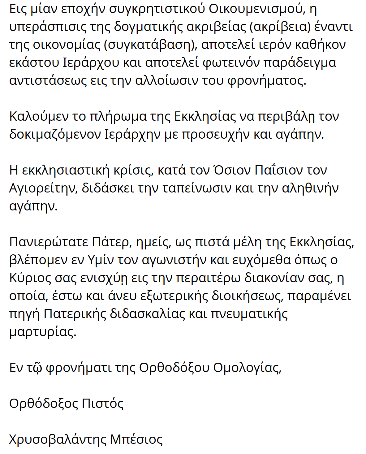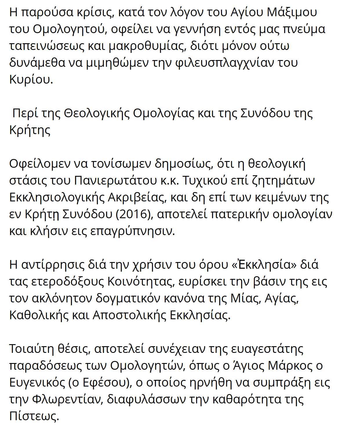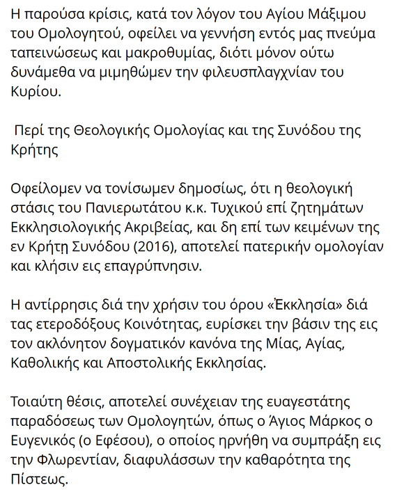 The laity emphasize that Metropolitan Tychikos's theological stance on issues of ecclesiological purity, especially regarding the texts of the 2016 Cretan Council, "represents a paternal confession and a call to sobriety". "The objection to the use of the term 'Church' in relation to heterodox communities is based on the unshakable dogmatic rule of the One, Holy, Catholic, and Apostolic Church", the letter states.
