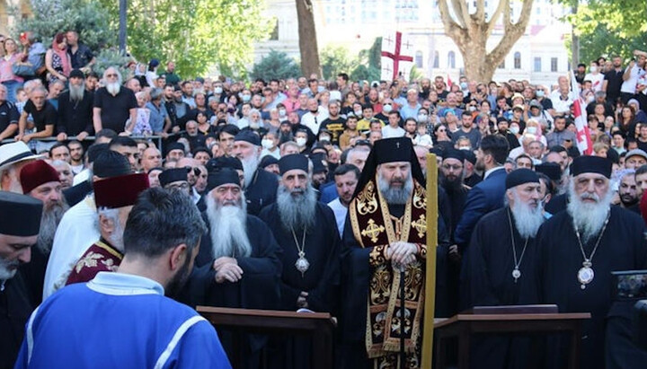 Ορθοστασία πιστών και κληρικών της Εκκλησίας της Γεωργίας ενάντια στην παρέλαση των ομοφυλοφίλων το 2021. Φωτογραφία: vetrovo