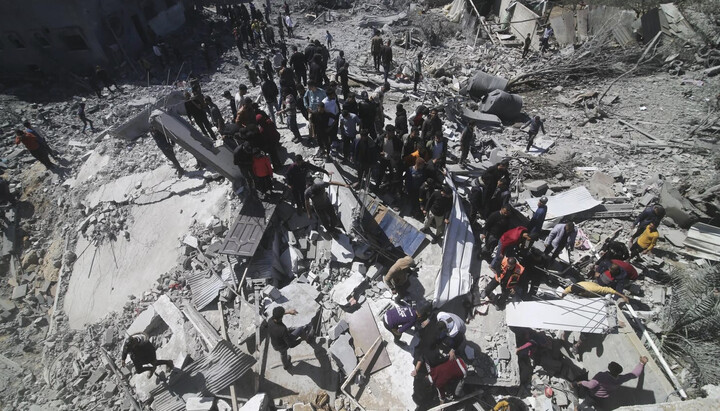 Οι Παλαιστίνιοι κοιτάζουν πολυκατοικία που καταστράφηκε από τις ισραηλινές δυνάμεις στη Ράφα, στη Λωρίδα της Γάζας, 20 Μαρτίου 2024. Φωτογραφία: cruxnow.com