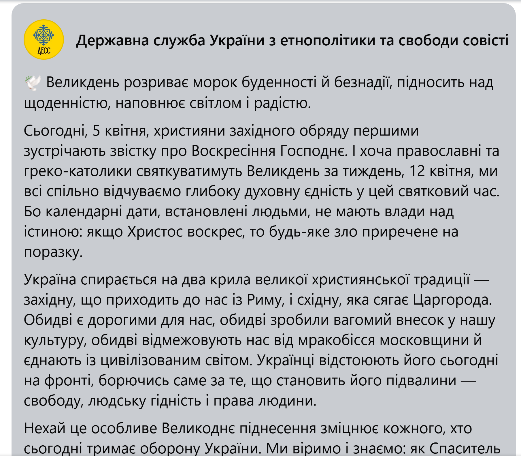 Στις 5 Απριλίου 2026 η Κρατική Υπηρεσία της Ουκρανίας για την Εθνοπολιτική δημοσίευσε πασχαλινό μήνυμα, στο οποίο δήλωσε ότι η χριστιανική παράδοση της Ουκρανίας «προστατεύει από τον σκοταδισμό της μοσχοβίας».