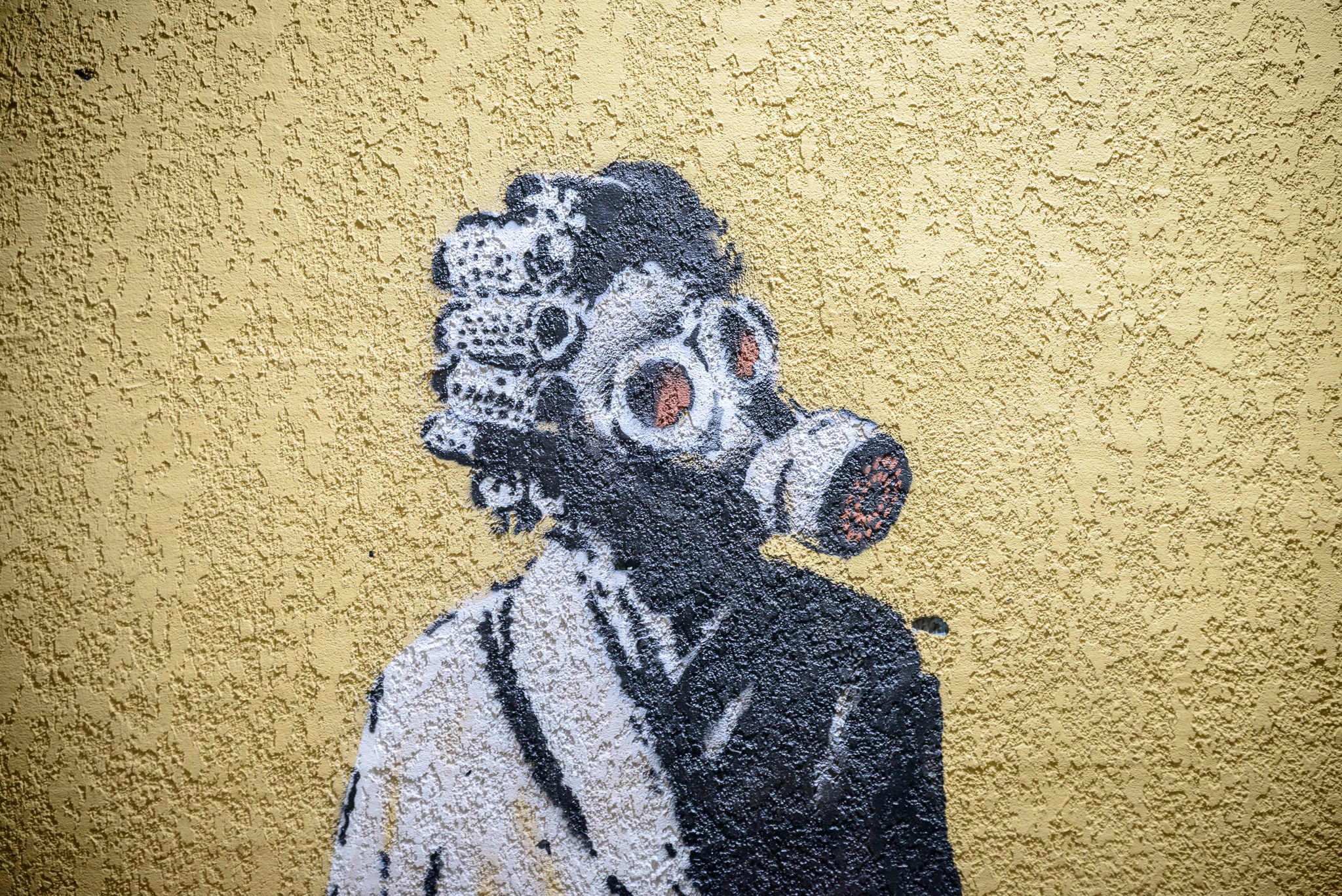 Fragment de perete cu graffiti de Banksy — imaginea unei femei în halat cu un extinctor și bigudiuri. Fotografie:  pagina de a Facebook a Rezervației Naționale Fragment de perete cu graffiti de Banksy — imaginea unei femei în halat cu un extinctor și bigudiuri. Fotografie: pagina de a Facebook a Rezervației Naționale