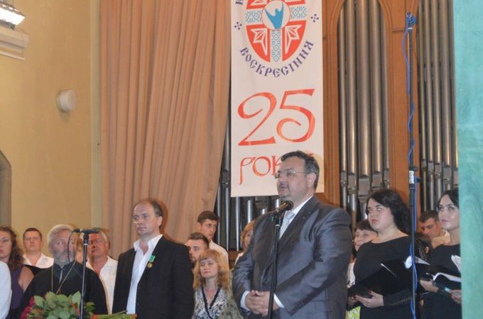 Секретарь Ровенской епархии митрофорный протоиерей Виталий Герлинский передал руководителям и хористам «Воскресения» благословение митрополита Ровенского и Острожского Варфоломея и поздравил всех со славным юбилеем.