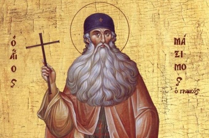 Преподобный Максим Грек жил в XV-XVI веке и был сыном богатого греческого сановника в городе Арте, в Албании. Он получил блестящее образование. В юности много путешествовал, изучал языки и науки в европейских странах, побывал в Париже, Флоренции, Венеции. По возвращении на родину прибыл на Афон и принял иночество в Ватопедской обители. В 1505 году он принял постриг с именем Максим. С тех пор, в течение 10 лет, его основным послушанием был сбор милостыни для афонских монастырей.