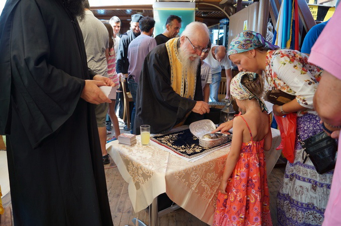 Насельники афонского скита святой Анны привозят на корабль ее нетленные мощи. По преданию, праведная Анна долгие годы не могла иметь детей, но Господь благословил святую за ее веру, и она родила на свет Пресвятую Богородицу. Именно поэтому святой Анне молятся об исцелении бездетные супруги.