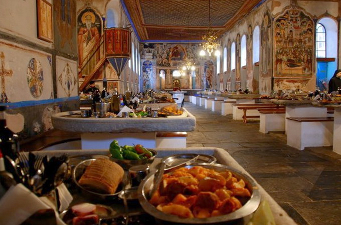 Во время монастырской трапезы на горе Афон монахи-афониты в течение всего года употребляют только одну воду. Но в день празднования больших церковных праздников, когда по монастырскому уставу разрешается потребление вина, на столе можно заметить бокалы, наполовину наполненные красным сухим вином.