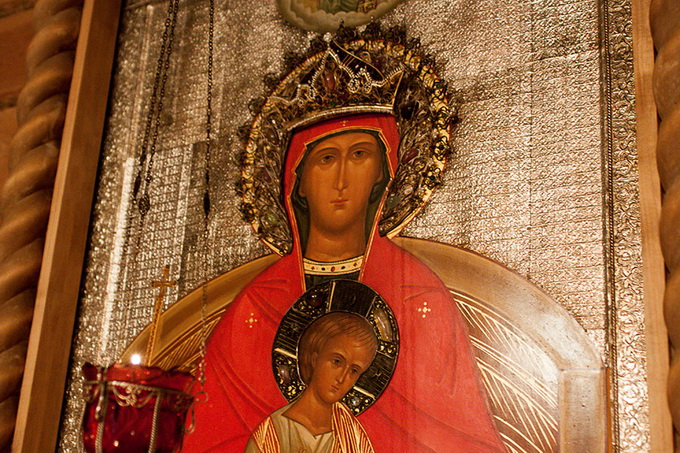 «Царю Небесный, Утешителю, Душе истины, Иже везде сый и вся исполняяй, Сокровище благих и жизни Подателю, прииди и вселися в ны, и очисти ны от всякия скверны, и спаси, Блаже, души наша», – шептала Евдокия вслед за батюшкой слова молитвы. Немного стерев пыль, священник и женщина обомлели: перед ними сидела на троне Владычица Неба и земли, Матерь Божия, облаченная в красную порфиру. Ее царственную главу венчала корона. В руках Богоматерь держала знаки царской власти над миром – скипетр и державу. Младенец-Христос на Ее коленях простирал благословляющую руку.