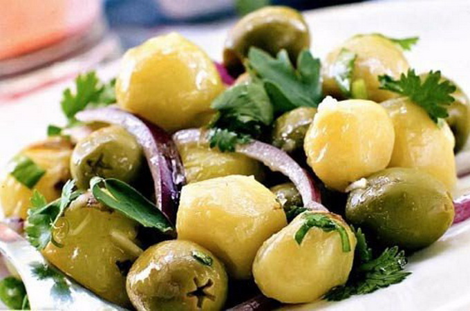 Мелко нарубленные ножом маслины смешиваются с картофелем, добавляется лимонный сок, а затем мелко нарубленный лук.