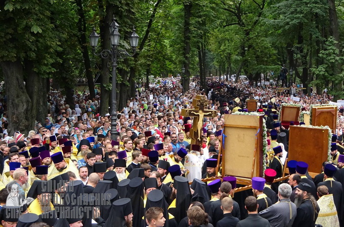 По окончании молебна верующие вслед за духовенством прошли со святынями Крестным ходом до Свято-Успенской Киево-Печерской лавры, где иконы тоже были установлены для почитания. В сам день государственного праздника и в церковный праздник св. Владимира – 28 июля – в Лавре прошла Божественная литургия с величанием Крестителя Руси.