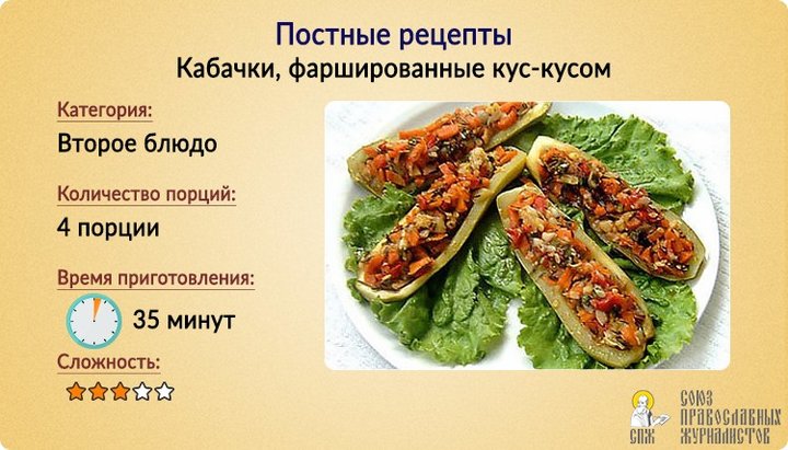 В Великий пост СПЖ предлагает рецепт замечательного традиционного блюда из овощей с новым акцентом. Поскольку сейчас кабачки можно купить круглый год, это – прекрасный вариант домашнего обеда или ужина.