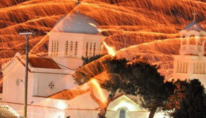 Как сообщается, залпы фейерверков, произведенные в пространстве между церквями Агиу Марку и Панагии Эрифиани превратили ночь в день.