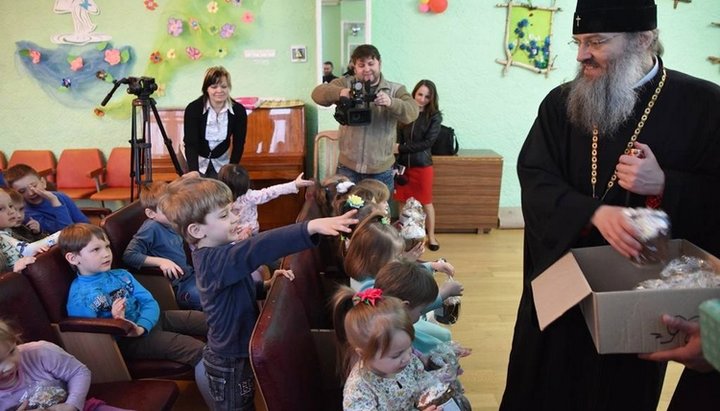 Митрополит Запорожский и Мелитопольский Лука (Коваленко) раздает пасхальные подарки детворе