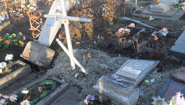 Выехав на место происшествия, полицейские выяснили, что по обе стороны от центральной аллеи на кладбище в нескольких местах повалены, разбиты и выломаны надгробные памятники, плиты и кресты на 14 захоронениях.