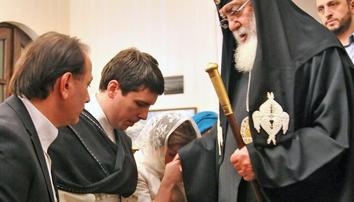 Предстоятель Грузинской Православной Церкви Илия ІІ благословляет обвенчавшуюся пару