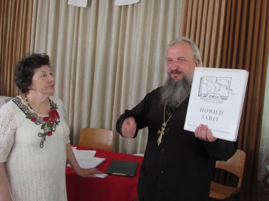 Батюшка поздравил членов общества с 85-летием создания товарищества и подарил центру аудиокниги Нового Завета.