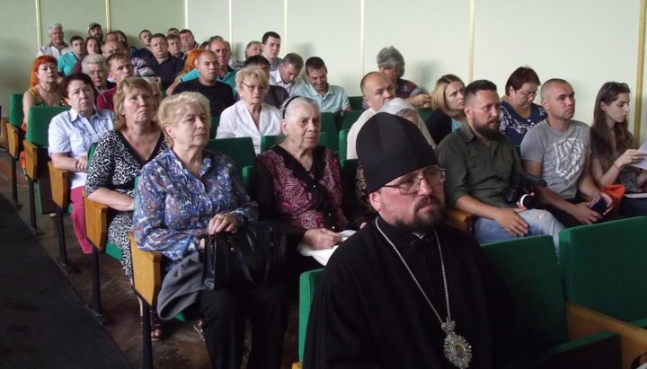 По сообщениям УНИАН, кроме нескольких десятков прихожан во главе с настоятелем храма Андрея Первозванного (УАПЦ) «отцом» Саввой, в зале присутствовали активисты из «Национального корпуса».