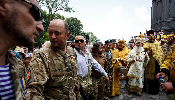 Глава Киевского патриархата Филарет в окружении своих прихожан на Владимирской горке 28 июля 2016 г.