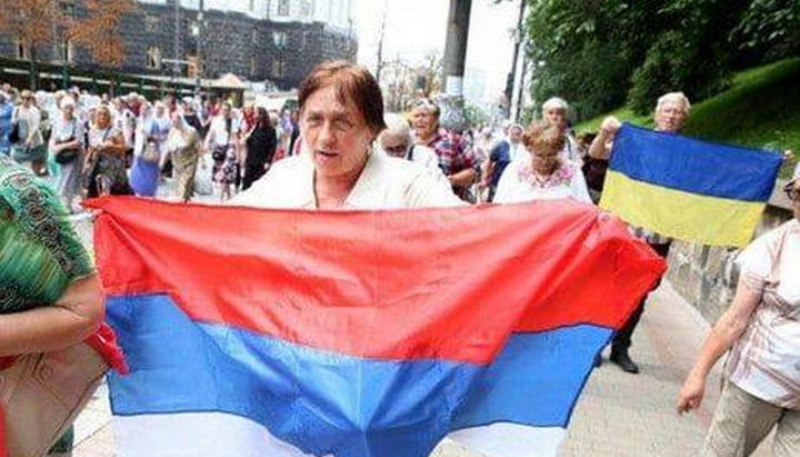Йдеться про жіночок середнього та літнього віку, які йшли з портретами царя та Патріарха Кирила, а потім почали розгортати прапори, серед яких був і російський. Їх було близько 20 чоловік і вони були разом у групі. Діяли організовано і абсолютно типово для людей, які саме за 200-300 грн беруть участь у різноманітних політичних мітингах.