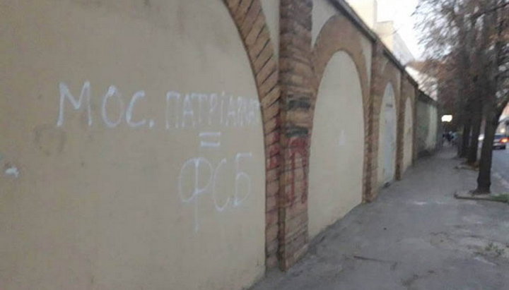 Провокационная надпись: «Московский Патриархат = филиал ФСБ» на стене храма во Львове