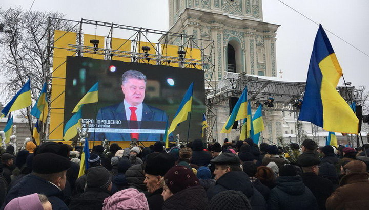 Глава государства приехал на Софийскую площадь, где его встречали собравшиеся на «совместную молитву» сторонники автокефалии. Затем Президент под колокольный звон проследовал к Софийскому собору.