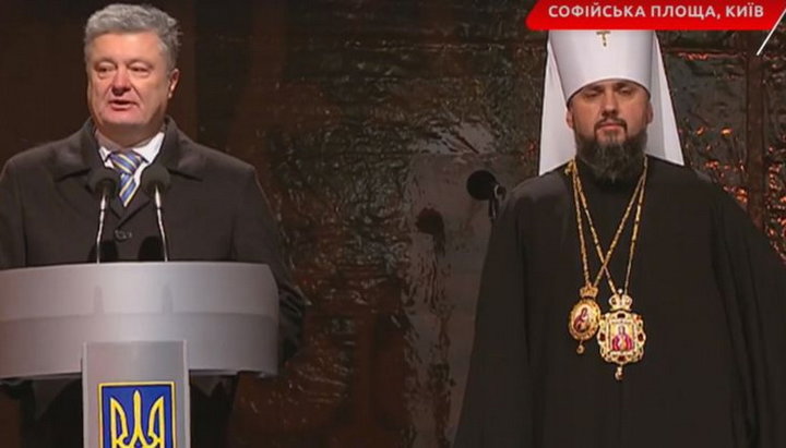 Стоя на сцене на Софийской площади в окружении политиков, «митрополит» Епифаний вместо благодарности Богу исполнил вместе с ними гимн Украины.