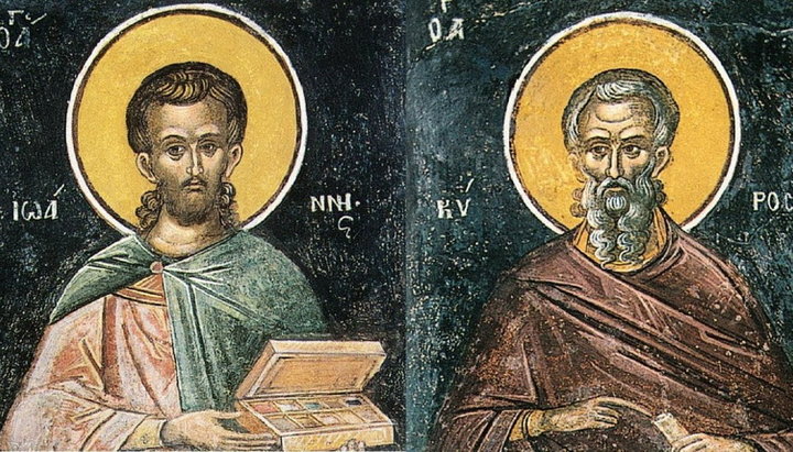 Святые мученики и бессребреники Иоанн и Кир Александрийские. Фреска Антониева монастыря в Новгороде. XII
