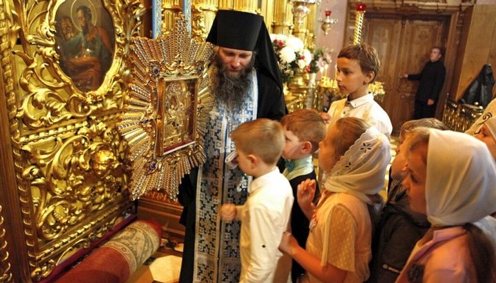 После молебна дети поклонились чудотворной «Почаевской» иконе Божией Матери, 30.05.2019. Фото: пресс-служба Почаевской лавры