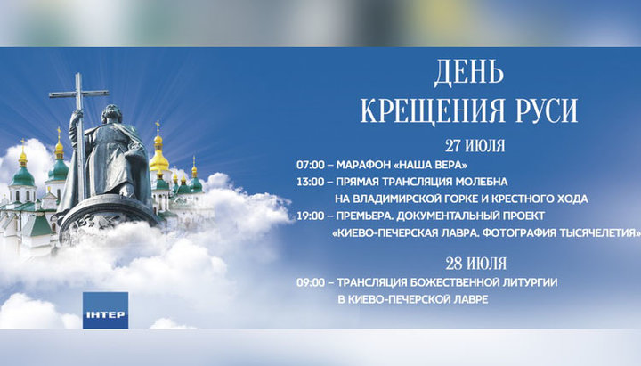 28 июля в 9:00 «Интер» продолжит серию праздничных программ по случаю Крещения Руси трансляцией праздничной литургии из Свято-Успенской Киево-Печерской лавры, на которой будут молиться Предстоятель УПЦ и представители Поместных Православных Церквей.