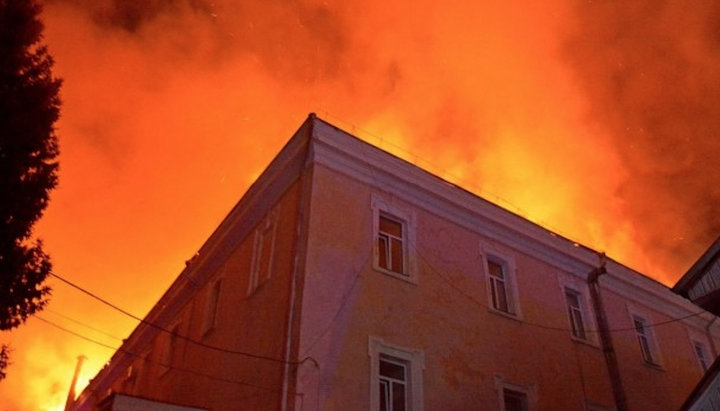 Пламя охватило здание военного госпиталя, в котором ранее находился храм УПЦ. Фото: «Волинські новини»