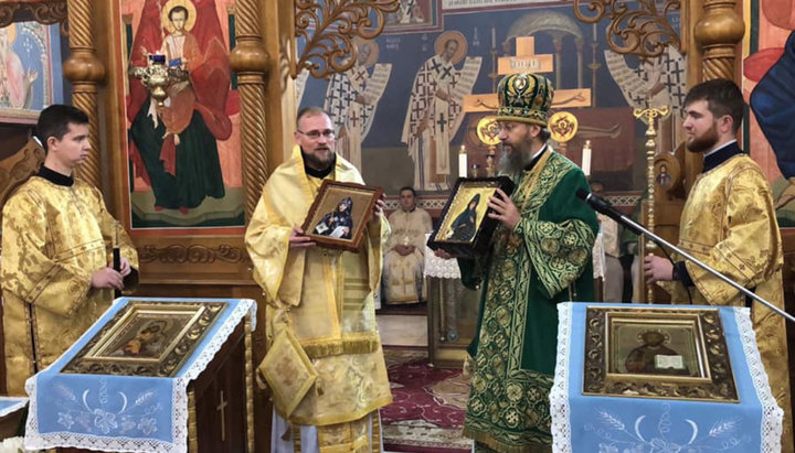 После Божественной литургии митрополит Антоний передал в дар Михаловско-Кошицкой епархии иконы с частицами мощей преподобной Елены Киево-Флоровской и святой Софии Покровской.