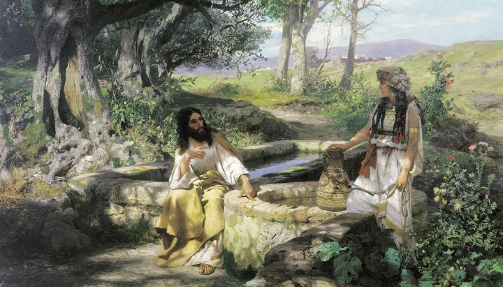 «Надлежало же Ему проходить через Самарию. Итак, приходит Он в город Самарийский, называемый Сихарь, близ участка земли, данного Иаковом сыну своему Иосифу. Там был колодезь Иаковлев. Иисус, утрудившись от пути, сел у колодезя. Было около шестого часа. Приходит женщина из Самарии почерпнуть воды. Иисус говорит ей: дай Мне пить. Ибо ученики Его отлучились в город купить пищи.