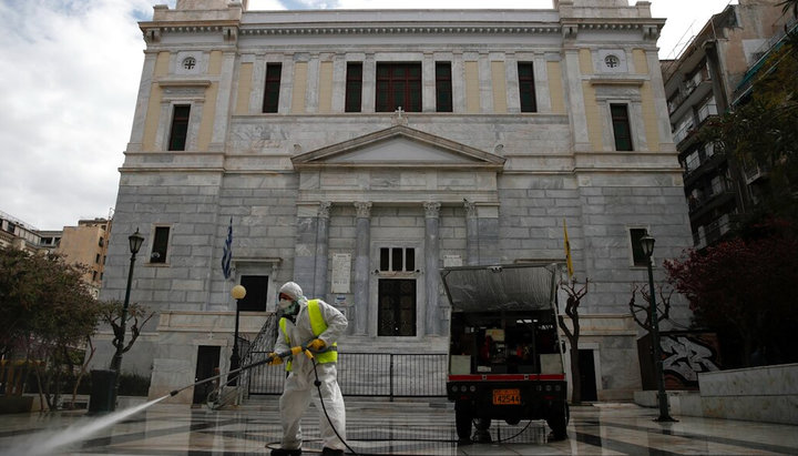 Дезинфекция территории возле храма святого Константина в Афинах. Фото: thenationalherald.com