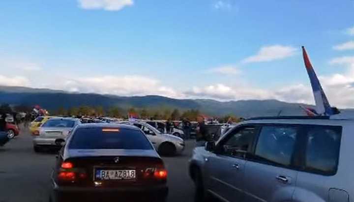 Колонна автомобилей длинной в километр проехала по улицам города, водители и пассажиры этих авто скандировали: «Не дадим святыни!», «Черногория поднялась, святыни нужно защищать!».