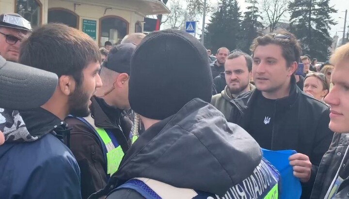 Ветеран боевых действий объясняет радикалу, что пришел защитить свою святыню. Фото: СПЖ