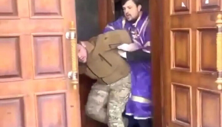 Иподиакон Ростислав выводит провокатора из собора. Фото: glavcom.ua