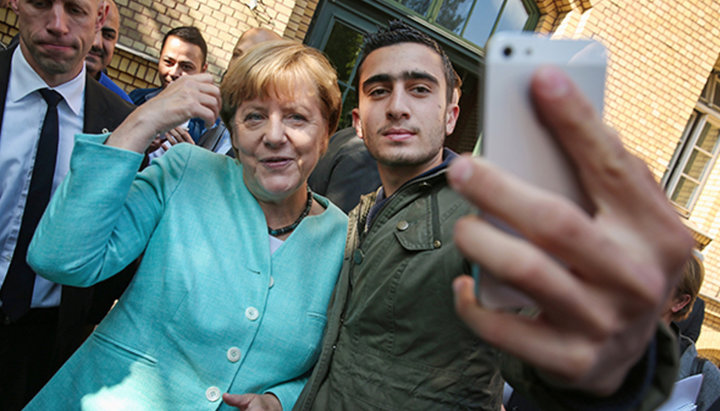 Ангела Меркель фотографируется с одним из мигрантов, прибывших в Германию. Фото: Sean Gallup/Getty Images