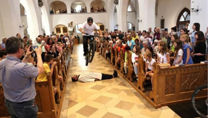 На видеокадрах видно, как мужчина в шлеме едет внутри костела на велосипеде и перепрыгивает через лежащего на полу пономаря. За представлением наблюдали несколько сотен прихожан и участников богослужения.