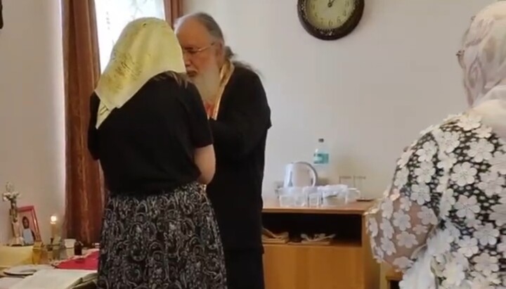 На видео видно, как верующие смотрят литургию онлайн, через смартфон, позже священник их причастил.