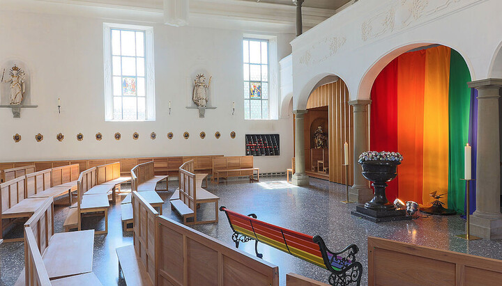 Возле бокового придела храма, недалеко от алтаря, расположена «Библия», содержащая тексты, оправдывающие ЛГБТ, а недалеко от нее – радужная скамья.