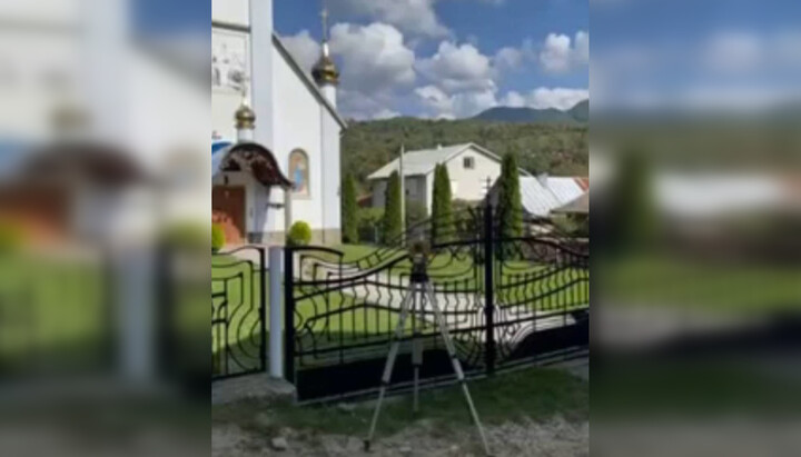 Геодезическое оборудование землемеров ПЦУ у храма УПЦ в с. Луг. Фото: скриншот видео Telegram-канала «Дозор на "Першому Козацькому"»