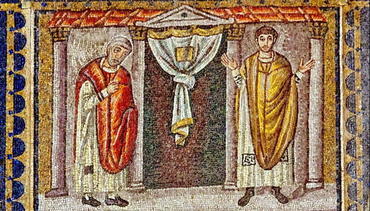 Притча о мытаре и фарисее (Лк. 18, 9-14). Италия. Равенна. VI в. Мозаика в базилике Сант-Аполлинаре-Нуово. Фото: ruicon.ru