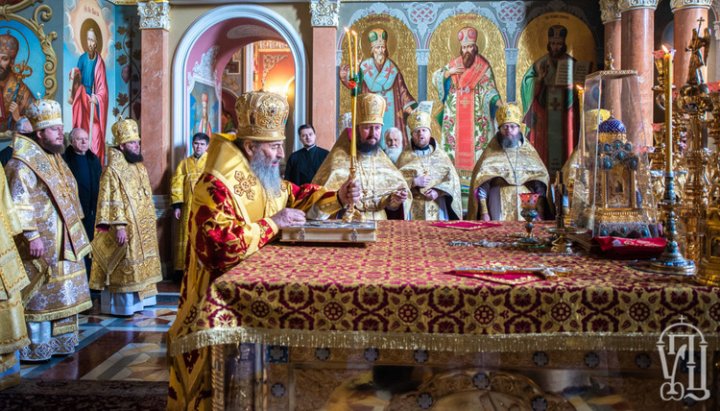Архипастырю сослужили наместник обители митрополит Вышгородский и Чернобыльский Павел, управляющий делами УПЦ митрополит Бориспольский и Броварской Антоний, архиепископ Бучанский Пантелеимон, епископ Барышевский Виктор, епископ Белогородский Сильвестр, епископ Ирпенский Лавр, епископ Бородянский Лавр, гости в священном сане и духовенство монастыря. За богослужением молился митрополит Донецкий и Мариупольский Иларион.