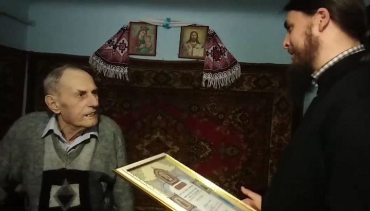 Пономаря Василия Драгомарецкого поздравляют с 90-летием и вручают награду с грамотой от Предстоятеля УПЦ. Фото: скриншот видео со страницы прихода Успенского храма УПЦ в Михальче в Facebook.